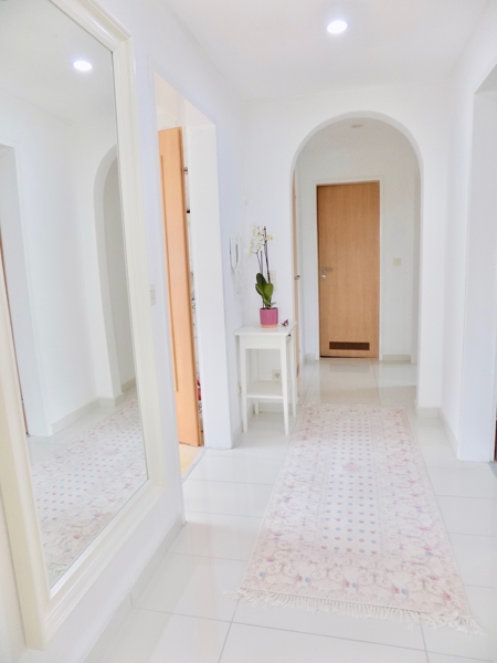 Sie betreten die Wohnung und befinden sich in einem hellen Flur. Von hier aus gelangen Sie zu den einzelnen Wohnräumen. Die Wohnfläche verteilt sich auf ein Schlafzimmer, ein Kinderzimmer, ein separates WC, ein Bad mit bodenebener Dusche, eine helle, offene Küche mit moderner EBK, dem großzügigen Wohnbereich mit Zugang auf den Balkon. Von hier haben Sie einen wunderbaren Blick auf die Burg "Weibertreu".