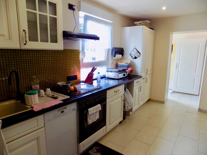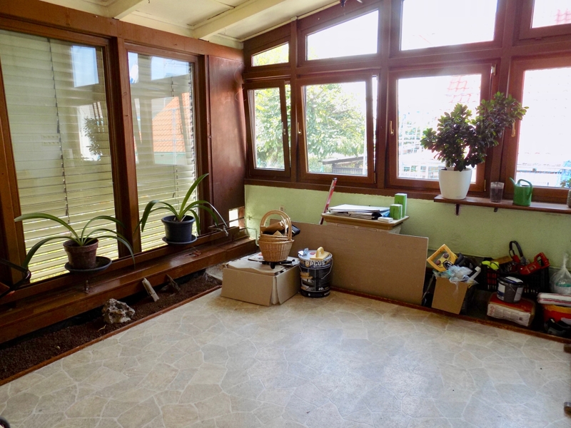 Im Erdgeschoß ist ebenso der Haupteingang, ein helles Wohnzimmer und Schlafzimmer, eine grosse Küche mit EBK und die Gästetoilette mit Tageslicht. Hier ist auch der Zugang zum Wintergarten mit elektrischen Jalousien und anschließender kleiner Terrasse. Der Gartenbereich bietet genug Platz für verschiede Aktivitäten.