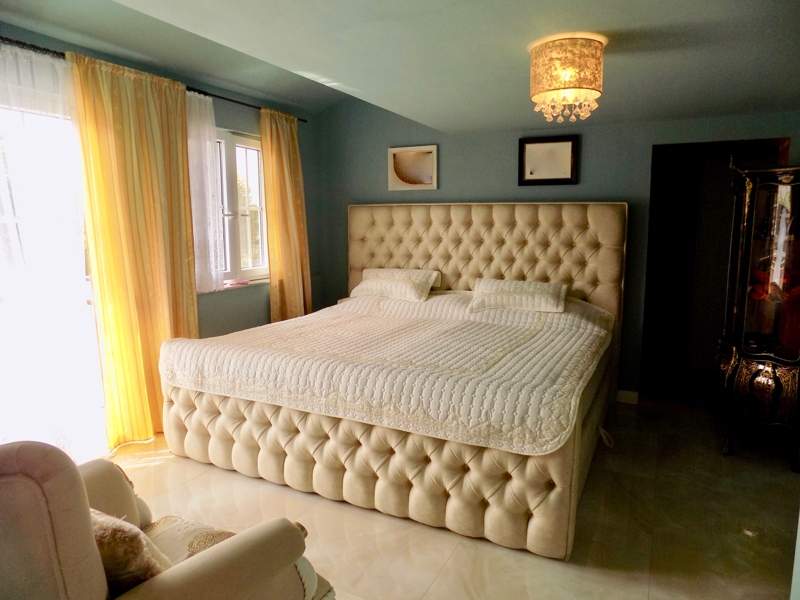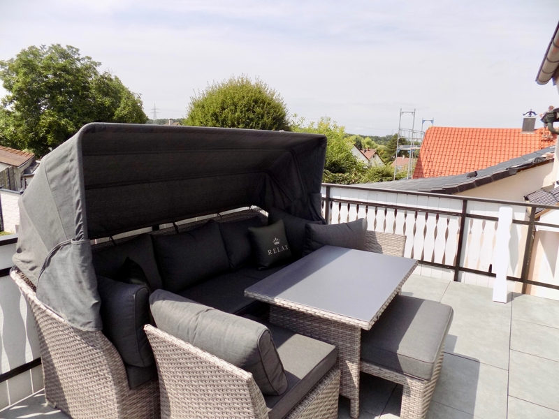 Im 1. OG kommt man über den Flur in das großzügige Schlafzimmer und das daneben liegende Gästezimmer. Das Schlafzimmer wurde mit einer Gaube vergrössert und hat einen Ausgang zum Balkon. Hier kann man in entspannter Privatsphäre eine tolle Zeit verbringen.