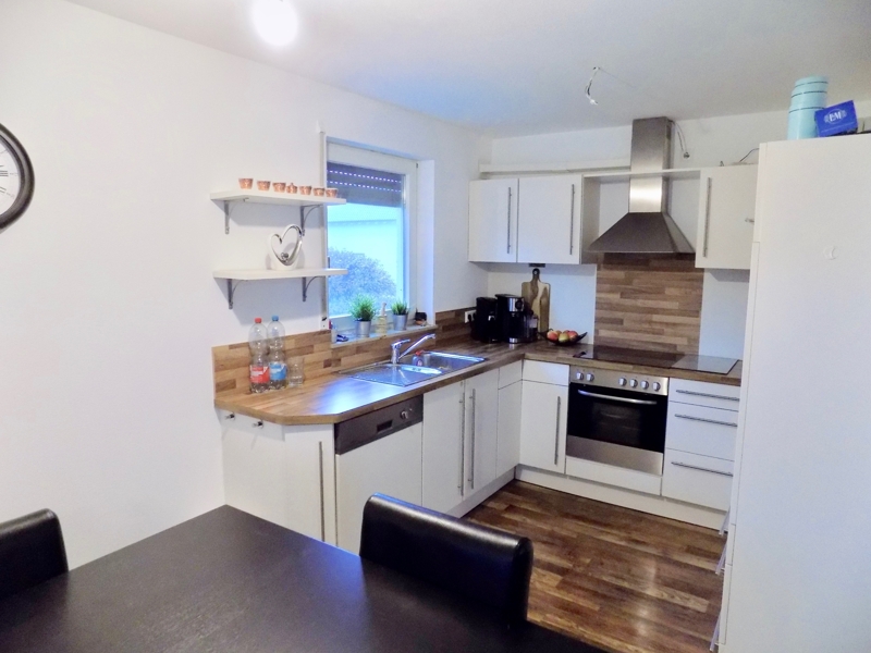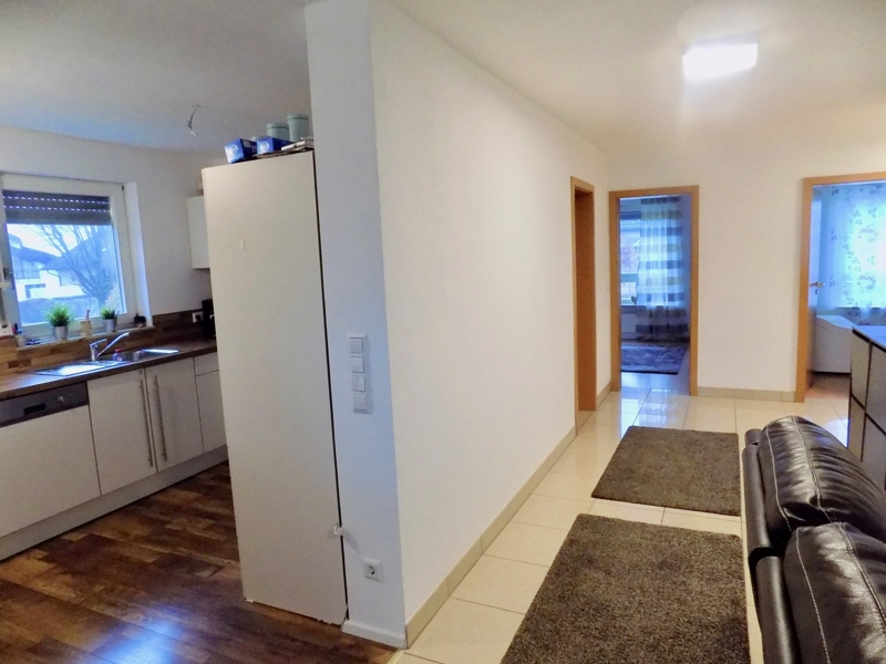 Die Wohnung ist gut geschnitten, alle Zimmer sind hell und freundlich. Sie hat ein großes Wohn- und Esszimmer mit Ausgang zur Terrasse, Schlafzimmer, Kinderzimmer, offene Küche mit EBK, Badezimmer mit Tageslicht, Badewanne, Dusche und Waschmaschinenanschluss. Ein Gäste- WC rundet den Gesamteindruck ab.