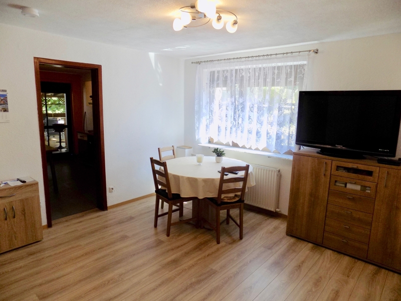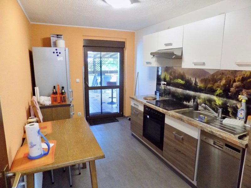 Hier gibt es ein helles Wohnzimmer, Schlafzimmer, Badezimmer mit Dusche , WC und Küche mit EBK. Hier ist auch der Ausgang zur sehr großen Terrasse, wo Sie Sie ungestört verweilen und im Schatten die heißen Sommertage genießen können.